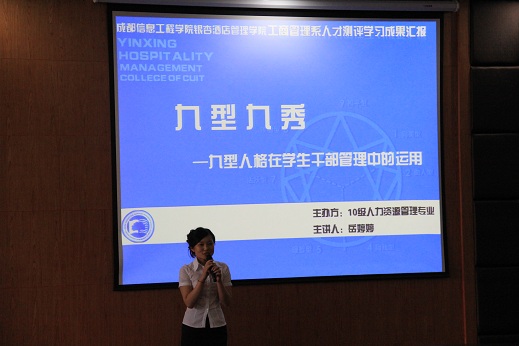 这次课程汇报由工商系2010级人力资源管理专业两个班其中的6个同学组成汇报团。由何宇主持汇报,岳婷婷担任汇报主讲。汇报以“九型人格在学生干部管理中的运用”为主要汇报内容。